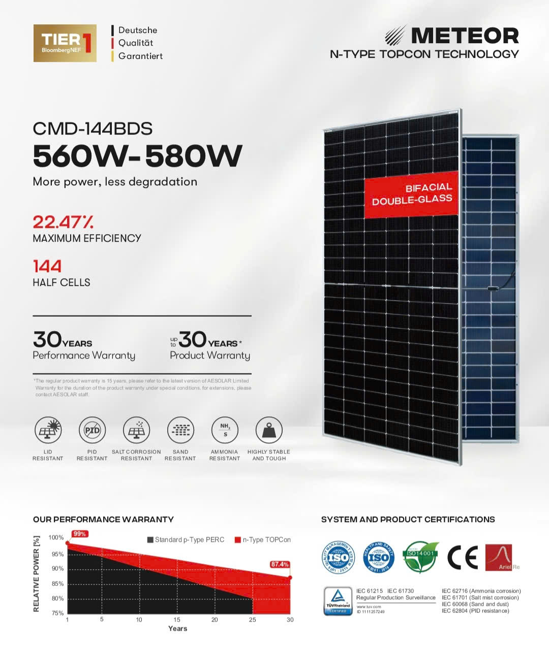 – AE Solar đảm bảo chất lượng cao và hiệu suất tốt nhất của các mô-đun quang điện do chỉ sử dụng các nguyên liệu và linh kiện cao cấp từ các nhà cung cấp Tier 1 Hạng A đảm bảo hiệu suất hoạt động trên 80% trong 30 năm và 15 năm về các vấn đề do lỗi nhà sản xuất. Dựa trên các tiêu chuẩn quốc tế thông qua các bài kiểm tra về mức độ hoạt động với tần suất cao và chịu được trong môi trường ngoài trời khắc nghiệt.