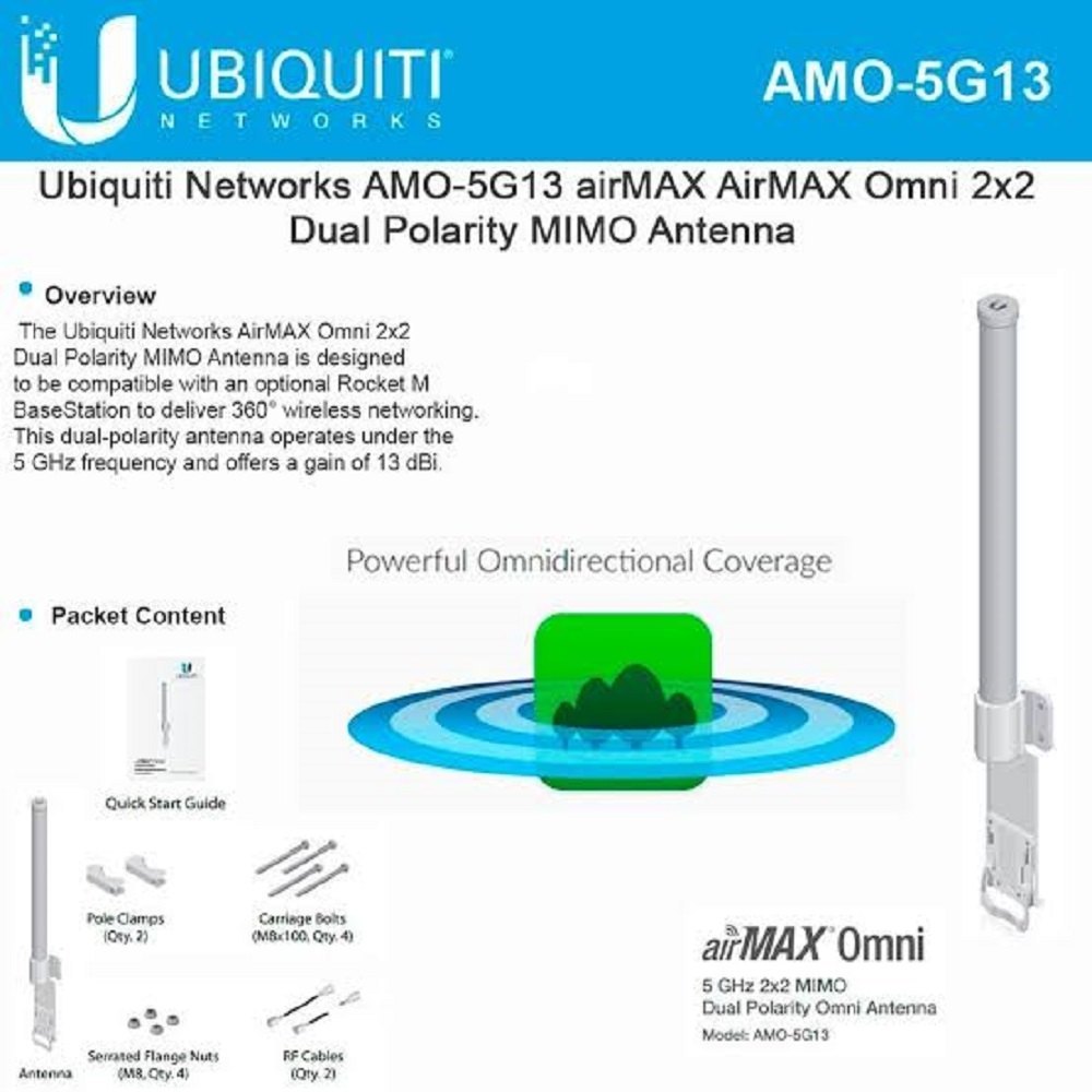 Omni Antenna AMO 5G13(AMO-5G13) là sản phẩm ăng ten wifi đầu tiên thuộc loại có thiết kế Omni hai cực đã được cấp bằng sáng chế, cung cấp phạm vi phủ sóng 360 °.