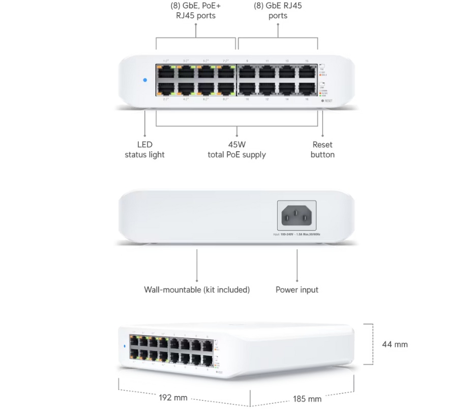 UniFi Lite 16 PoE là switch 16 cổng Gigabit, với 8 cổng PoE+, tổng công suất 45W, thiết kế nhỏ gọn, lắp đặt linh hoạt.