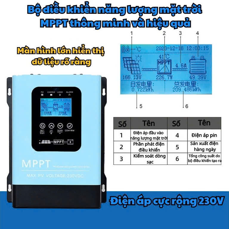 Bộ điều khiển sạc MPPT có thể phát hiện điện áp phát điện của tấm pin mặt trời theo thời gian thực và theo dõi giá trị điện áp và dòng điện tối đa (VI), cho phép hệ thống sạc pin với công suất đầu ra tối đa. Hiệu suất sạc được cải thiện đáng kể, với tỷ lệ chuyển đổi lên tới 98%