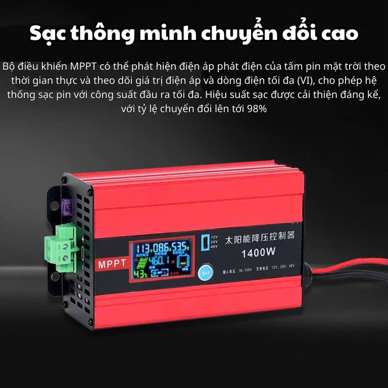 Bộ điều khiển MPPT có thể phát hiện điện áp phát điện của tấm pin mặt trời theo thời gian thực và theo dõi giá trị điện áp và dòng điện tối đa (VI), cho phép hệ thống sạc pin với công suất đầu ra tối đa. Hiệu suất sạc được cải thiện đáng kể, với tỷ lệ chuyển đổi lên tới 98%