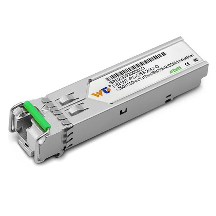 Module quang WINTOP YTPS-G53-20LD- 1.25G SFP SM WDM Tx1550/Rx1310 DFB 20KM LC with DDM.- Khoảng cách truyền cáp quang: 20km LC with DDM.- Cổng kết nối quang: LC.- Bước sóng quang: TX: 1550nm; RX: 1310 nm.- Tốc độ truyền dữ liệu: 1.25G WDM SFP.- Giao diện kết nối quang Single Fiber LC.- Nhiệt độ hoạt động: 0 - 70°C- Nguồn điện: 3.3V.- Hỗ trợ Hot Pluggable.- Hàng chính hãng WINTOP.- Bảo hành: 12 tháng.