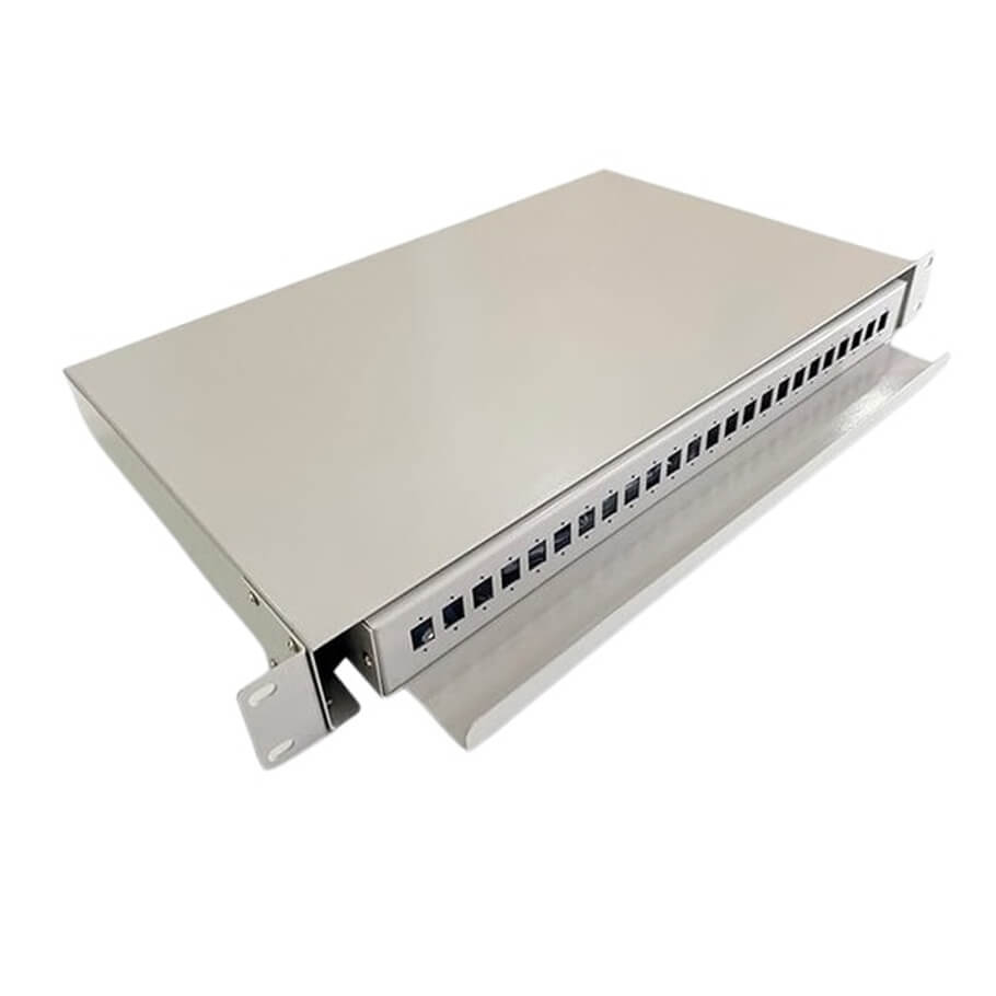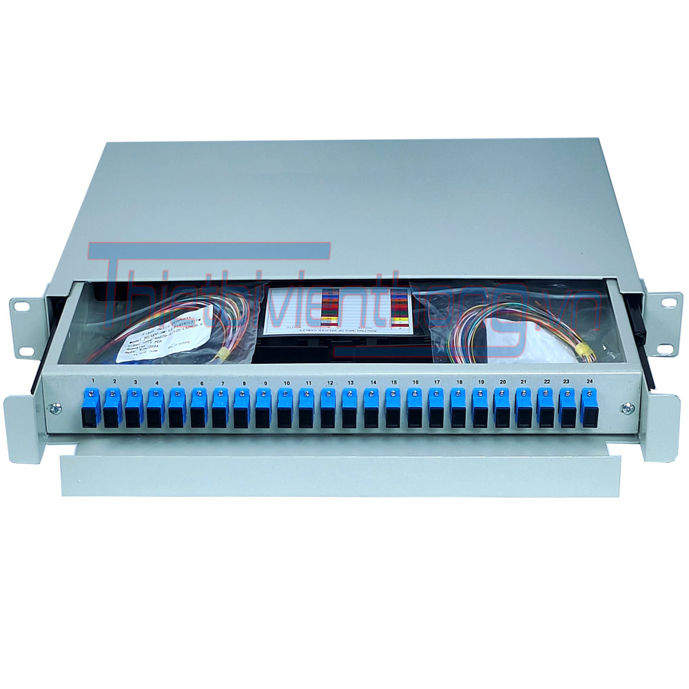 Khay trượt gắn rack 19 inch ODF 24FO- ODF khay trượt gắn rack 19” (đầy đủ phụ kiện bao gồm dây nối quang SC/UPC).- Dùng để kết nối và phân phối sợi quang.- Tất cả các khay chứa mối nối quang thông dụng đề có thể lắp đặt được.- Kiểu lắp đặt: Trên giá 19 inches, thiết kế theo dạng trượt và độ sâu có thể điều chỉnh được tối đa 120mm.- Dung lượng cho 24 sợi quang.- Đầu giao tiếp quang: FC (đầu vặn ren), SC (đầu vuông), ST (đầu gài tròn), LC (đầu vuông nhỏ).- Vật liệu vỏ: Thép sơn tĩnh điện.- Dễ dàng lắp đặt không cần dụng cụ chuyên dụng.- Thiết kế theo kiểu dạng trượt trên thanh ray có thể kéo ra ngoài trong khi lắp đặt.- Có thể xếp chồng lên nhiều khay chứa mối nối quang.- Nhiệt độ làm việc: -30°C ~ 80°C.- Độ ẩm: ≤ 95%.- Có độ rộng thích hợp để gắn trên giá 19 inches và chiều cao phụ thuộc vào dung lượng của ODF.