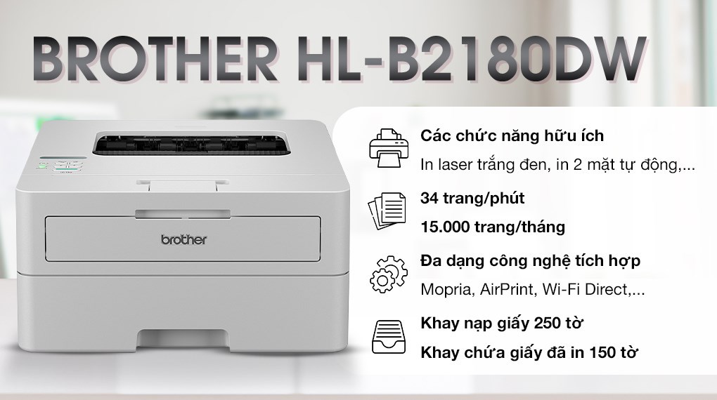 Máy in laser đen trắng Brother HL-B2180DW dễ dàng sử dụng cho các doanh nghiệp vừa và nhỏ, kích thước 183 mm x 356 mm x 360 mm gọn gàng bạn có thể đặt trên bàn làm việc với cân nặng 7,5 kg. Sản phẩm in ấn đen trắng chất lượng khi sử dụng mực in chính hãng của Brother, bạn sẽ được trải nghiệm các bản in chất lượng, rõ nét. Dễ dàng sử dụng với bảng điều khiển LCD 16 ký tự x 1 dòng, dễ dàng bật tắt, thời gian khởi động máy nhanh gọn, tiết kiệm điện năng khi sử dụng, tự động ngừng cung cấp điện khi không sử dụng đến sản phẩm.