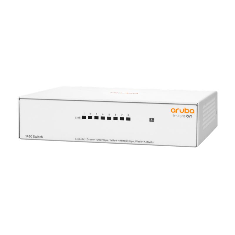 Thiết bị chuyển mạch Switch Aruba Instant On 1430 5G (R8R45A) là dòng Switch Gigabit Ethernet Unmanaged dễ sử dụng (Plug-and-play) hỗ trợ 8 Cổng mạng RJ45 với tốc độ 10/100/1000 Mbps, có chức năng chuyển mạch Layer 2 Ethernet để kết nối với các thiết bị khác mà không cần cấu hình mạng phức tạp. Là giải pháp hoàn hảo cho nhu cầu sử dụng ở phân khúc phổ thông, Aruba 1430 8G (R8R45A) cũng được thiết kế để đáp ứng tất cả các thiết bị trong mạng của người dùng, bao gồm IoT.Thông số kỹ thuật của Aruba 1430 8G (R8R45A):Kích thước: 138 x 157 x 37 mmTrọng lượng: 0,59 kgSố cổng mạng: 8 cổng RJ-45 autosensing 10/100/1000 MbpsTốc độ Lan: GigabitCông suất chuyển đổi: 11,90 MppsDung lượng chuyển mạch: 16 GppsHỗ trợ: Quality of Service (QoS) và flow control cho VoIP, VideoĐịa chỉ MAC (# of entries): 8192 entriesNguồn điện vào: DC 12V-1ACông suất tiêu thụ tối đa: 12 WChế độ hoạt động: Unmanaged (Plug-and-play)Thiết kế để bàn, có thể gắn tủ rack.