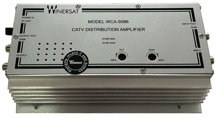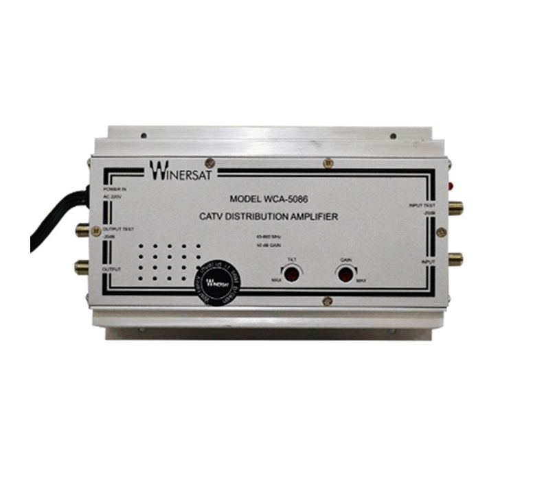 Khuếch đại tín hiệu truyền hình cáp Winersat WCA 5086 là bộ khuếch đại tín hiệu anten chảo dùng để khuếch đại tín hiệu cho hệ thống truyền hình cáp. Có thể khuếch đại lên đến 40 - 60 tivi, tín hiệu đầu ra rõ đẹp như tín hiệu gốc, tránh tình trạng nhiễu hình, mờ hình. Hoạt động trong dải tần từ 40~860MHz, độ giao động tần số lên đến 50dB. Khắc phục tín hiệu suy hao nhiều khi cáp đi âm tường, dây cáp chạy dài <100m.;