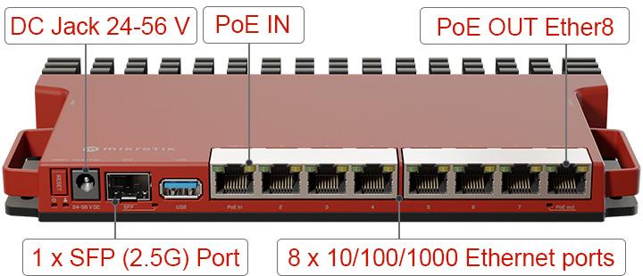 Router MikroTik L009UiGS-RM có thiết kế màu đỏ hiện đại sang trọng với 8 cổng 1G RJ45 và 1 cổng SFP hỗ trợ kết nối linh hoạt 1G hoặc 2.5G. Router sử dụng nguồn DC Jack 24-56 V hoặc PoE In tại cổng Ether1, nó có khả năng cấp nguồn PoE OUT cho các thiết bị khác thông qua cổng Ether8. 1 cổng USB 3.0 type A cho phép bạn kết nối tới Modem di động LTE giúp mở rộng khả năng kết nối WAN internet đảm kết nối internet tin cây ổn định khi không có mạng cố định.
